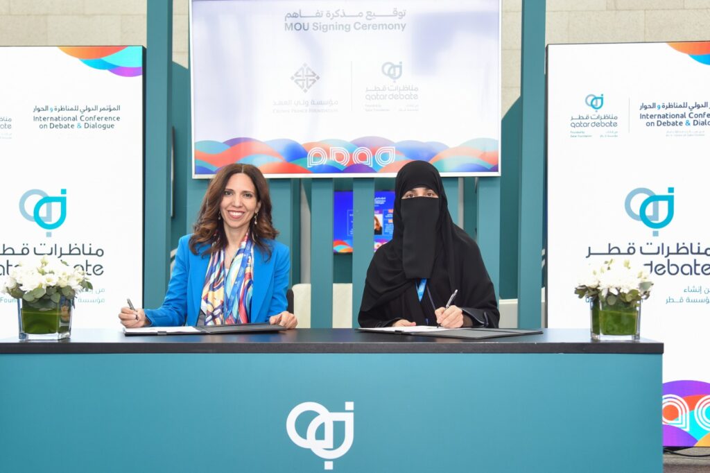هذا وقد وقعت الدكتورة حياة عبد الله معرفي – الرئيس التنفيذي لمركز مناظرات قطر- عدد من اتفاقيات التعاون على هامش المؤتمر مع :” مؤسسة ولي العهد في المملكة الأردنية الهاشمية، المؤسسة التي تتولّى مهمّة الإشراف على تنفيذ مبادرات سمو الأمير الحسين بن عبدالله الثاني، ولي عهد المملكة الأردنيّة الهاشميّة والتي تعمل على تنفيذ عدد من المبادرات والبرامج الشبابية الرائدة والهادفة إلى تمكين الشباب الأردني وتوجيههم للمشاركة في خدمة وتطوير مجتمعاتهم ويمثلها من الجانب الأردني الدكتورة تمام منكو المدير التنفيذي للمؤسسة.