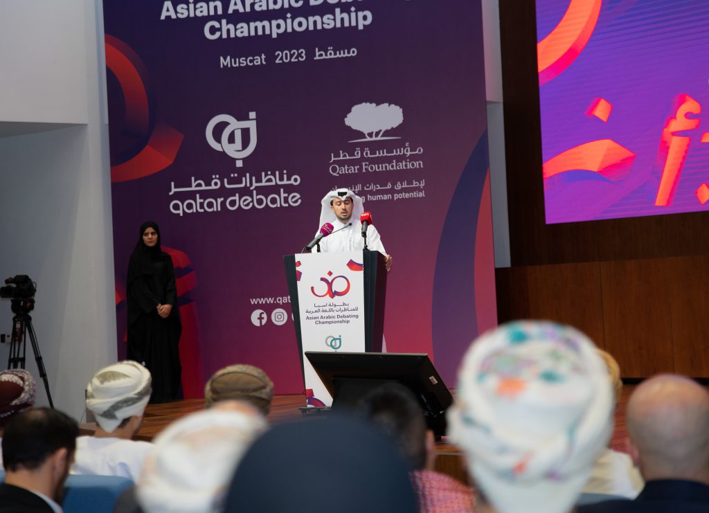 The second edition of the Asian Debating Championship kicked off today, January 29th, 2023. Organized by QatarDebate a member of Qatar Foundation – a member of Qatar Foundation for Education, Science and Community Development – in Muscat, Oman. under the patronage of his excellency Basel Bin Ahmad Alrawas – under-secretary of the ministry of culture, sports and youth, in addition to president of the board of directors of Oman Debate his excellency Faris bin Fatek Al- Saeed. Among the attendees were distinctive partners and representatives of different youth organisations, with QD representatives led by Mr Abdulrahman Alsubaei. The ceremony commenced with a welcome speech by A QatarDebate ambassador Ms Hawa Aljaradi in which she expressed her delight in hosting this championship in her home country Oman. She also highlighted QD’s efforts in fostering and harboring dialogue and debate in Arabic around the world, with efforts to build bridges of discussion on academic grounds.